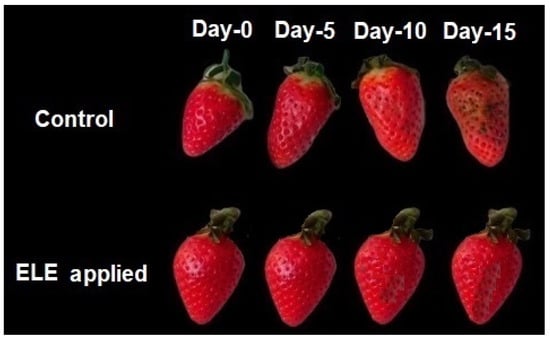 The appearance of control and ELE-treated strawberries after at 0, 5, 10, and 15 days of storage at 2.0 ± 0.3 °C.