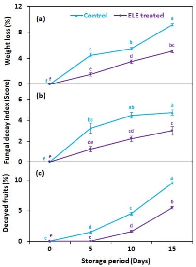 Effect of eucalyptus leaf extract (ELE) on (a) fruit weight loss, (b) fungal decay index, and (c) decayed fruits of strawberries during cold storage. The treatment means sharing same letter were not significantly different (p < 0 .05) by the honestly significant difference test. The vertical bars indicate the (±) standard error of the mean and the data is the average of four replicates.