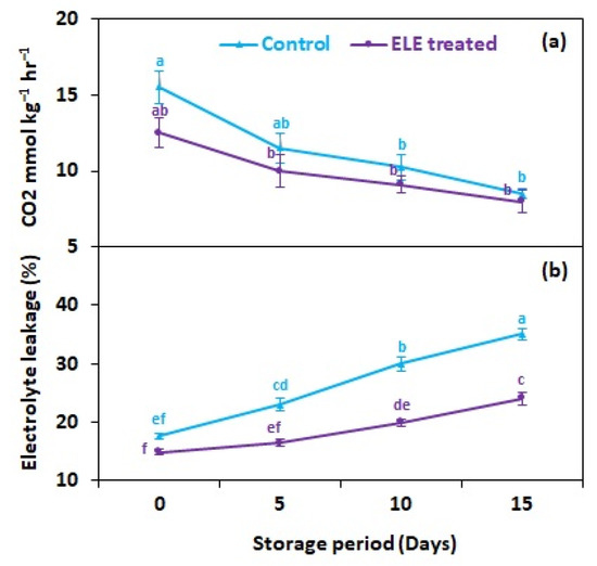 Effect of eucalyptus leaf extract (ELE) on (a) fruit CO2 mmol kg−1 h−1 and (b) relative electrolyte leakage of strawberries during cold storage. The treatment means sharing same letter were not significantly different (p < 0 .05) according to the honestly significant difference test. The vertical bars indicate the (±) standard error of the mean, and the data is the average of four replicates.
