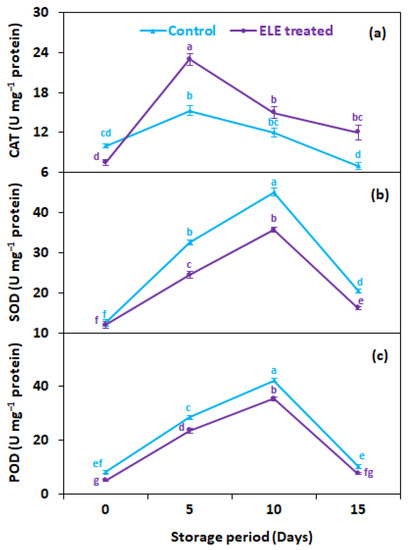 Effect of eucalyptus leaf extract (ELE) on (a) catalase, (b) superoxide dismutase, and (c) peroxidase of strawberries during cold storage. The treatment means sharing the same letter were not significantly different (p < 0 .05) according to the honestly significant difference test. The vertical bars indicate the (±) standard error of the mean and the data is the average of four replicates.
