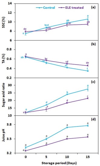 Effect of eucalyptus leaf extract (ELE) on (a) soluble solid contents, (b) titrable acidity, (c) sugar–acid ratio, and (d) juice pH of strawberries during cold storage. The treatment means sharing the same letter were not significantly different (p < 0 .05) according to the honestly significant difference test. The vertical bars indicate the (±) standard error of the mean and the data is the average of four replicates.