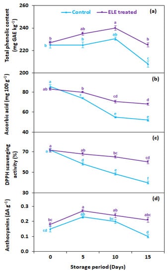 Total phenolic contents (TPC) gradually declined during the entire storage period regardless of ELE application (Figure 6a). On average, ELE application significantly reduced the decrease in TPC of strawberry fruits compared with untreated ones. After 15 days of cold storage, higher TPC (225 mg GAE kg−1) was recorded in ELE-treated strawberries in contrast to the untreated control (208 mg GAE kg−1) (Figure 6a). Ascorbic acid content gradually reduced during cold storage, both in ELE-treated and control strawberry fruits; however, ELE-treated fruits had higher levels of ascorbic acid than control (Figure 6b). After 15 days of storage, the ascorbic acid content in the control decreased from 85.5 to 52.0 mg 100 g−1, while it decreased from 83.0 to 67.9 mg 100 g−1 in ELE-treated fruits (Figure 6b). The lowering of ascorbic acid content in control fruits can be attributed to the increased respiration rate of fruits, which increased the deteriorative oxidation reaction of ascorbic acid. Anthocyanins increased during the early storage period, but their levels decreased after the fifth day both in control and ELE-treated fruits (Figure 6c). The rate of reduction in total anthocyanins was relatively high in the control (0.1 ΔA g−1) compared with the ELE-reated (0.21 ΔA g−1) (Figure 6b). The changes in phenolic, ascorbic acid, and anthocyanin contents were consistent with earlier studies carried out on the postharvest preservation effects of ALV on strawberries, plums, and peaches, and ELE on passion fruits and nectarines [19,22,41,43,50]. Total antioxidants in terms of 2,2-diphenyl-1-picrylhydrazyl (DPPH) radical scavenging activity showed a similar pattern of change as total phenolic contents, ascorbic acid, and anthocyanins in response to ELE during storage at 2 °C for 15 days. However, the ELE-treated strawberries showed higher DPPH compared with untreated fruits. On the 15th day of storage, the DPPH was higher (60.1%) in ELE-treated strawberries than in control fruits (40.0%) (Figure 5a). Likewise, previous investigations also reported DPPH preservation with exogenous application of chitosan for strawberries [49,52], grapes [53], and tomatoes [54]; ALV preserved DPPH in litchi [45], sapodilla [55], and raspberry [47]; and salt solution preserved higher DPPH in grapes [56] and Mesembryanthemum [57]. The decline in total antioxidants in the untreated fruits at the end of storage might be due to the release of free radicals leading to senescence and decay. This finding indicated that ELE treatment not only can extend shelf life but can also retain higher antioxidant activity in strawberries after prolonged storage. So, it can be assumed that increased DPPH after longer storage in strawberries treated with ELE is probably triggered by a decrease in the formation of free radicals and postponed senescence.