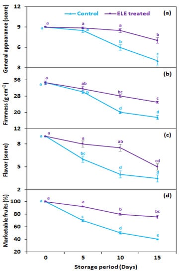 Effect of eucalyptus leaf extract (ELE) on (a) general appearance, (b) firmness, (c) flavor, and (d) marketable fruits of strawberries during cold storage. The treatment means sharing same letter were not significantly different (p < 0 .05) as indicated by the honestly significant difference test. The vertical bars indicate the (±) standard error of the mean and the data is the average of four replicates.