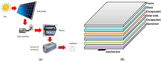 Solar energy system configuration and composition of a c–Si panel [2,17]. (a) Configuration of solar energy system; (b) composition of c–Si panel.