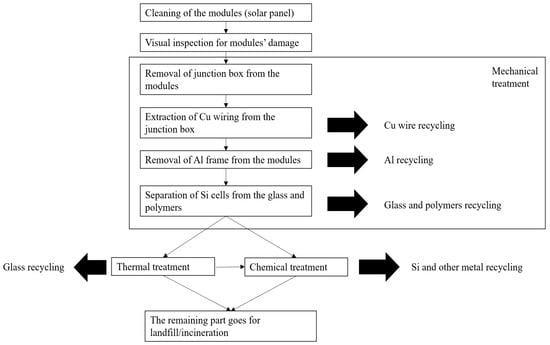 The end–of–life (EOL) management of solar panels is evolving, and it considers the harmful effects and market values of substances in the waste. The EOL management of solar panels is summarized in Figure 2. Solar panels, including their junction boxes and cables, are cleaned as a general step. Visual inspection is then carried out to detect any damage to the panels. Subsequently, three treatments can be carried out: mechanical treatment (also called physical treatment), chemical treatment, and thermal treatment [16]. Mechanical treatment is a physical separation, where crushing and seizing processes are applied to the PV panel modules [13,32]. Prior to this treatment, the frame, electrical cables, and junction box are removed. The remaining parts of the solar panels are crushed and refined to pieces of 4 to 5 mm in size using a hammer mill. During the refinement, glass and polymers are naturally separated from other large pieces due to the size of the mill cutting. The remainder goes through either a thermal treatment or a chemical treatment.