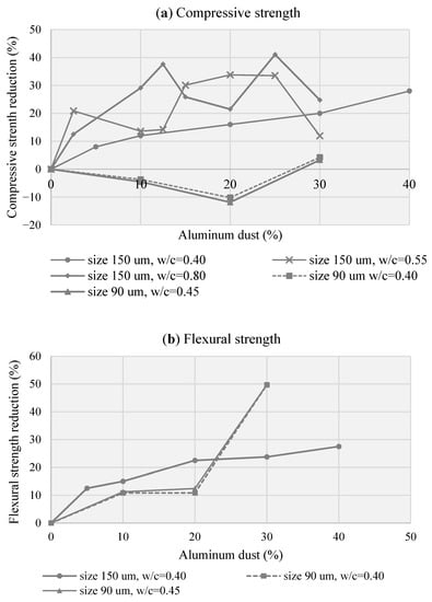 In most of the previous studies, aluminium (Al) waste was crushed into a powder (i.e., aluminium dust) and added as a cement replacement material in concrete. These investigations highlight a general reduction in the mechanical properties of the modified materials. Mailar et al. [38] quantified this reduction by testing the compressive and flexure strengths of concrete with different Al dust contents. Concrete samples with two different water–cement ratios (0.40 and 0.45) were tested, with an average Al dust size of 90 µm. Similar tests investigated the mechanical properties of Al–waste–incorporated concrete with an average Al size of 150 μm and water–cement ratios of 0.40, 0.55, and 0.80 (see, for example, Elinwa and Mbadike [36] and Mbadike and Osadere [37]). The resulting compressive and flexural strengths are summarized in Figure 3. The observed test results clearly show that mechanical properties in concrete further reduce with an increase in Al dust content. This can be attributed to the fact that Al dust affects the bonding strength between aggregate and cement paste, thereby reducing the mechanical properties of the concrete [74]. In addition, Al dust can absorb water in the concrete mix, reducing water content and thus affecting the strength of the concrete. Furthermore, Al dust generates hydrogen gas when in contact with water, increasing pressure in the concrete and reducing its strength [36].