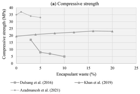 For durability, Dulsang et al. [78] showed that concrete’s sorptivity coefficient can be reduced by over 92.1% when encapsulant content reaches 10%. They also found that concrete weight loss reduces from 15% to 5% when encapsulant waste increases from 3% to 10%. Increased tortuosity due to encapsulant waste leads to sorptivity reduction and acid–resistance enhancement.