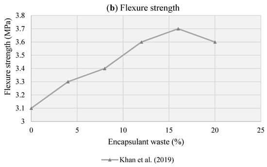 Only Khan et al. [79] quantified changes in the 28–day flexure strength among these studies. Flexure strength increases by 17% when encapsulant waste reaches 20% due to the water–reducing effect of the encapsulant. More studies are also needed in this field.