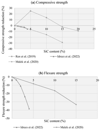 Małek et al. [82] and Idrees et al. [42] indicated that the highly abrasive nature of SiC leads to an increase in concrete strength, even with a small amount of SiC content. Małek et al. [82] and Idrees et al. [42] also found an increase in flexure strength due to the highly abrasive nature of SiC in concrete mix and the promotion of hydration in the cement (Figure 5b). More studies are, therefore, needed to clarify the effect of SiC on concrete properties.