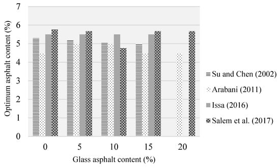 Optimum asphalt content vs. glass asphalt mixtures [86,87,88,89].