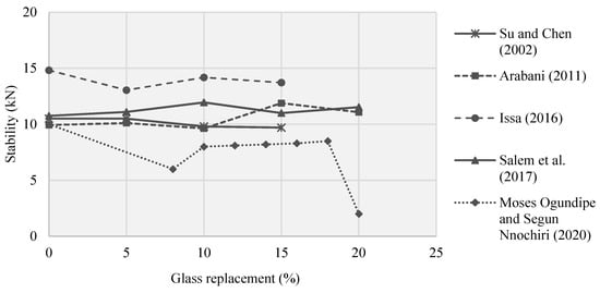 The results in Figure 6 highlight that stability is slightly reduced with the increase in waste glass in the asphalt mixture. However, until the waste glass content in the asphalt mixture reached 20%, no significant reduction in stability was observed. Adhesion loss between the binder and glass, skid resistance loss, reduced stripping resistance, and increased ravelling potential were identified as the main reasons for this reduction in stability [85]. The presence of broken glass in the mixture has also been reported to contribute to reductions in stability. However, these issues can be corrected by adding lime to the mixture [86]. Marandi and Ghasemi [91] indicated that adding rubber polymers can also eliminate degradation in the stability of an asphalt mixture with a glass content of up to 5%.