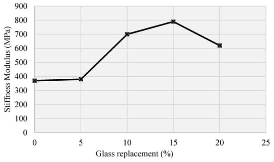 Arabani [87], Issa [88], and Salem et al. [89] also summarized the properties of asphalt mixtures with the additions of waste glass based on the Marshall test, as summarized in Table 5. Table 5 shows the changes in flow, voids in the mineral aggregates in asphalt concrete with and without waste glass, the void percentage filled with bitumen in asphalt concrete with and without waste glass, and so on. It can be seen from Table 5 that there was no significant reduction in these properties with the increase in the waste glass percentage in the asphalt–concrete mixture. However, further studies are needed to find a more reliable estimation of these property changes due to conflicts in the current studies. For example, Arabani [87] found an increase in flow with glass content increments. However, Issa [88] found a decrement in the flow instead. In addition, Arabani [87] tested the stiffness modulus of asphalt–concrete mixtures with waste glass content, shown in Figure 7. It can be seen from Figure 7 that adding waste glass to asphalt mixtures increases their stiffness due to the interlocking effect of glass between mixed particles.