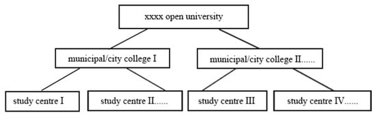 In the headquarter-peripheral structure of the Open Universities in China, such as headquarters—provincial branches—city-level colleges—county-level study centres, it is the “study centre” that provides various kinds of educational services (see Figure 1). The local study centres not only need to handle routine management in alignment with the regulations and directives from the higher level of administration but also provide a full range of learning support services to the learners registered at their centres, including the allocation of tutors, student registration and examination, communications, and daily management of the centre and affective support if learners are in need. As the last ring in the OE chain of course delivery, their diverse nature and operation mode indirectly lead to their different roles, while their differentiated teaching and learning quality directly determines the provision of quality of educational services, affects their social reputation, and induces them to form different types of institutions. Therefore, the local study centre is considered the cornerstone of the quality in the entire OE system and plays a crucial role in guaranteeing the quality of teaching and learning and the well-being and happiness of the learners [49].