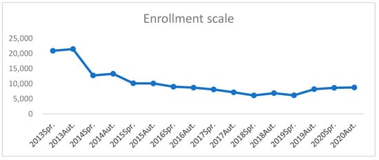 In this study, the school of open learning of JOU was selected as the research object. JOU, the member university of Mega Open University Alliance recognised by UNESCO and a flagship higher educational institution in terms of teaching and learning quality, enrolment scale, and total qualities of management in China, performs a good sample for the research of sustainable development in OE. JOU runs independently with its courses for the province, while the school of open learning is responsible for relaying the courses by the headquarters of the National Open University of China. The school of open learning in JOU currently has more than 60,000 registered students scattered across the province; of course, the number of student enrolments has been decreasing in recent years because of the active participation from the conventional universities with the provision of MOOCs (see Figure 2).