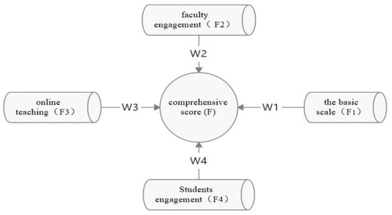 The model for scoring and the model for comprehensive score (F) of the relevant factors can be obtained through the table of factor loading values and total variance interpretation. Having determined the evaluation significance of the main factors, the linear expression of each factor on the original index variables was obtained in line with the factor loading matrix. Finally, the comprehensive score of the four main factors was generated by calculation F = W1xF1 + W2xF2 + W3xF3 + W4xF4, in which the four main factors F1, F2, F3, and F4 replaced the original 15 basic observation indicators from the comprehensive assessment model for educational quality in local study centres (see Figure 3), F was the comprehensive evaluation index, W represented the weight, which was composed of the variance contribution rate corresponding to the eigenvalues of the main factors. The model for the score of the factors and the comprehensive score F can be seen in Figure 4: