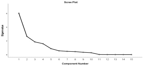 To guarantee the accuracy of factor extraction, the cross-validation of the number of factors was adopted, and the weight of the information of the variables covered by the factors was presented visually by scree plot (see Figure 5). As shown in the figure, the horizontal coordinates represent the number of factors extracted, the vertical coordinates represent the characteristic roots of the factors, and the scree plot of the variation of the characteristic roots with the number of factors is formed in alignment with the order of the factors extracted. Accordingly, it can be seen that the eigenvalues of the first four factors were larger, and the total contribution can explain the original variables more completely, while the eigenroot value after the fourth factor was smaller and the contribution to the explanation of the original variables is negligible, according to which it can be verified that it is sound and reasonable to extract the first four main factors for analysis in this study.
