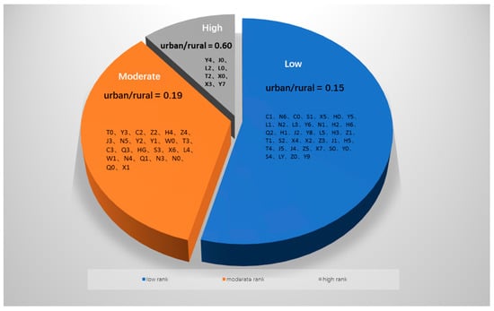 The ranking of the study centres based on the total scores and the ratio of urban and rural study centres. Note: In the pie chart, the letter stands for the initial of a region, and the number represents a study centre. 0 means an urban centre, while 1 − n stands for a rural centre.