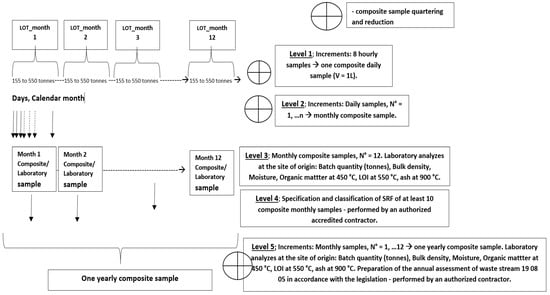Technical standards [,] are the source of the SRF sampling concept and characterisation procedure. The samples and subsamples preparation and their storage take place in 5 levels (Figure 2): (i) Level 1—one sample increment (grab sample) every three hours of pellets production, (ii) Level 2—daily representative samples, (iii) Level 3 and Level 4—batch/monthly samples, and (iv) Level 5—annual representative sample.