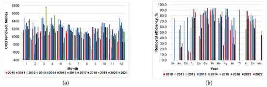 Key dynamics of the CWWTPL efficiency potential from 2010 to 2021: (a) seasonal COD removal fluctuation, and (b) the average annual removal efficiency of heavy metals from raw municipal wastewater (SM: Tables S2–S8) [].