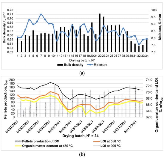 Quality and quantity dynamics of batch series in 2021: (a) bulk density and moisture of batch representative samples, and (b) seasonally fluctuation of pellets production, their organic matter content at 450 °C, and LOI at 550 °C and 900 °C.