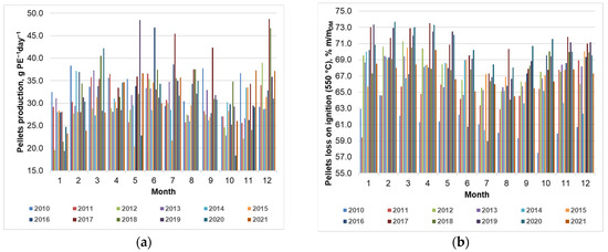 Seasonal dynamics in pellets’ production and quality in 2010–2021: (a) seasonal production in gDM per PE in one day, and (b) seasonal fluctuation of their volatile matter (LOI).