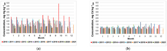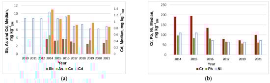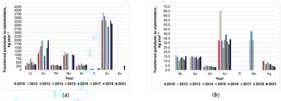 The obtained data (Table 2, Table 3 and Table 4) are essential from the point of view of wastewater treatment, protection of natural water sources, and further procedures for the final use of pellets. The purpose of the multi-year data is to assess the pellets’ quality and their end users’ supply dynamics. It should not only look at the basic parameters for pellets classification as a solid alternative fuel. If the goal is the sustainable consumption of pellets, it is also necessary to know the dynamics of macro-, micro-, and trace elements. These data enable careful consideration of the transfer of pollutants to the final stakeholders, with the aim of efficient and safe management of combustion plants, flue gas cleaning, and optimal ash management, which are essential aspects of the sustainability of energy use. In 2010–2021, the prescribed sum of concentrations of analytes Sb, As, Pb, Cr, Co, Mn, Ni, and V [] fluctuated between (in mg kg−1) 841 (2010), 1001 (2012), 1126 (2021), and 1140 (2014). Figure 7a presents the annual amount (except for the years 2015 and 2017, when the basis for the calculation was the average value for monthly representative samples) in the order of magnitude from 65 kg (V in 2012) to 3839 kg (Zn in 2012) of HMs transferred to stakeholders. Figure 7b presents the transferred amount up to 65 kg. Regarding the amount of heavy metals transferred to stakeholders in 2010–2021 (Figure 7), the order is as follows (in average mass (kg) ± relative standard deviation (RSD) in %): Zn (3351 ± 9.81) > Cu (1543 ± 25.6) > Mn (1071 ± 6.93) > Cr (460 ± 28.2) > Ni (325 ± 14.6) > Pb (303 ± 11.6) > Sn (290, No = 1) > V (78.7 ± 21.6) > Co (35.9 ± 35.1) > Mo (35.6 ± 16.8) > As (18.8 ± 8.45) > Sn (13.4 ± 17.0) > Hg (6.06 ± 24.8) > Cd (4.02 ± 13.5). According to one measurable measurement of thallium in 2016, its annual amount transferred was 550 g. The obtained data show us the difference in the quality of the pellets, which depends on the characteristics of the catchment area (organic load of wastewater expressed as PE, number of inhabitants, industrial activity, mixed or separate sewage system) and the influence of atmospheric deposits, for example, Hg. The latter accumulates in the waste rainwater that flows to the municipal treatment plant. The trend of the annual transferred amounts of Hg shows a significant decrease, while the shares of other pollutants do not offer a marked tendency (Figure 7).