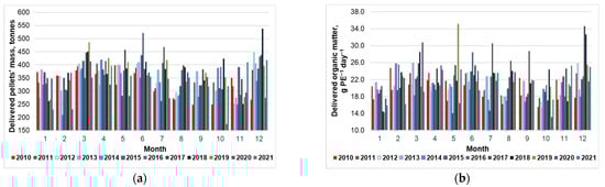 Figure 6 presents the seasonal dynamics in pellets production (on average, 31.4 gDM ± 5.6 gDM per 1 PECOD in one day) and their volatile matter as LOI in % m/mDM. In contrast, Figure 9 presents the dynamics in the delivered monthly amount of pellets in tonnes and their monthly average organic content expressed in g PE−1 day−1. The dynamics in Figure 4a (COD removal), Figure 6a and Figure 9a,b are comparable. On average, in terms of delivered combustible material, the transferred organic matter to stakeholders in 2010–2021 was (i) 21.2 ± 3.9 (in g per 1 PE COD in one day), (ii) 7.1 ± 0.6 (in tonnes per day), (iii) 217.4 ± 40.8 (in tonnes per month), and (iv) 2609 ± 1 (in tonnes per year).