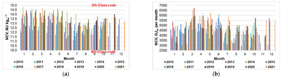 Only fuels derived from non-hazardous waste [,,] can be classified as SRF. Five quality classes divide each classification characteristic (SM: Table S10). Each classification characteristic should be considered equally important. The Class code combines all three key properties and shall be included in the specification. Fuel outside the ranges of the classes shall not be defined as SRF []. The SRF preparation proceeds with pellets’ characterisation and categorisation according to quality class criteria, focusing on the key parameters NCV, Cl, and Hg [,,]. The results of the chemical analysis of representative samples of each SRF production lot obtained over one calendar year must be statistically processed. At first, the authority contractor must determine the production lot size. The statistical distribution pattern of the characteristics parameters (average, median, and 80th percentile) evaluates the quality class of SRF. When the 12-month production is less than 15,000 tonnes, the lot size for classification shall be one-tenth of the amount produced in a 12-month rolling period. From 2010–2021, the annual pellets production at the CWWTPL is approximately 4200 tonnesar, and the monthly output varies by season, precipitation, and maintenance work (Figure 6a). After the statistical distribution pattern of the obligatory characteristics, the pellets’ Quality Class codes for 2021 were NCV 4; Cl 1; Hg 3, as was also determined in previous years [].