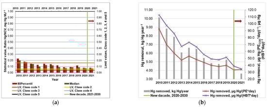 Review of Hg fingerprint at the CWWTPL in 2010–2021, based on a monthly representative sample (adopted after [] and supplemented with actual data for the year 2021): (a) the ratio Hg/NCV: the key environment characteristic of the SRF classification code, and (b) the annual transferred amount of Hg to the stakeholder expressed in µg Hg PECOD−1 in one day, and as µg Hg per one habitant (HBT) in one day.