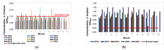Sulphur is the constituent of cysteine, methionine, glutathione, and several coenzymes. Therefore, sulphur is present in denatured proteins, the fundamental pellets’ constituents. The presence of sulphur in pellets means “natural background”; thus, the component considered must be an integral part of a comprehensive plan for optimal combustion facility management. On average, the pellets’ sulphur content is 0.7% m/mDM to 1.2% m/mDM (Figure 14b). According to Slovenian legislation, the limit value for the sulphur content in SRF is 0.2% m/mDM (Figure 14b) [], which means that pellets as a single SRF may not be used in Slovenia unless they are processed in an energy recovery facility placed at the site of origin.
