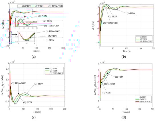 - The proposed TIDN-FOID controller provides the best results compared to PIDN and TIDN for structure-1, including thermal-thermal-biodiesel energy in area-1, thermal-thermal-GPPt energy in area-2, and hydrothermal energy in area-3. The results in Figure 4 show the superiority of TIDN-FOID compared to PIDN/TIDN, concerning the diminished level of peak overshoot (Δf1 = 0.0004 Hz, Δf2 = 0.0003 Hz, ΔPtie2–3 = 0.0021 p.u. MW, ΔPtie1–3 = 0.0004 p.u. MW), extent of oscillations, peak undershoot (Δf1 = 0.0153 Hz, Δf2 = 0.0093 Hz, ΔPtie2–3 = 0.0004 p.u. MW, ΔPtie1–3= 0.0042 p.u. MW), and settling time (Δf1 = 62.36 s, Δf2= 57.44 s, ΔPtie2–3 = 57.37 s, ΔPtie1–3 = 56.69 s).