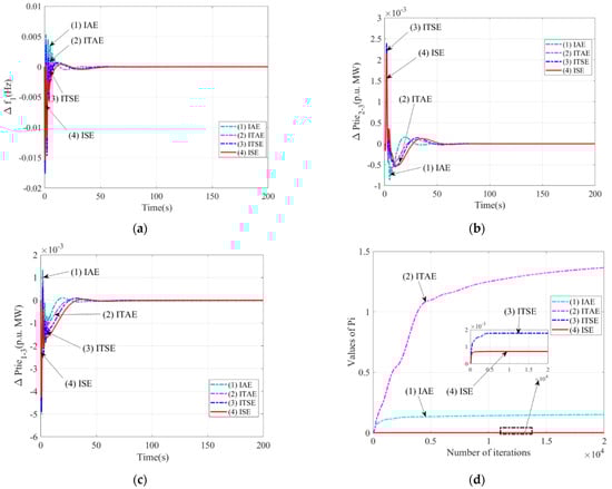 - The results in Figure 5 show the superiority of system dynamics, using performance index ISE, compared to IAE/ITAE/ITSE, concerning the diminished level of peak overshoot (Δf1 = 0.0004 Hz, ΔPtie2–3 = 0.0021 p.u. MW, ΔPtie1–3 = 0.0004 p.u. MW), extent of oscillations, peak undershoot (Δf1 = 0.0153 Hz, ΔPtie2–3 = 0.0004 p.u. MW, ΔPtie1–3= 0.0042 p.u. MW), and settling time (Δf1 = 62.36 s, ΔPtie2–3 = 57.37 s, ΔPtie1–3 = 56.69 s).