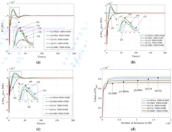 - Controller parameters are optimized by the SHO algorithm and the system dynamics with SHO optimized TIDN-FOID enhances system dynamics over WOA, CS, FA, and PSO techniques;