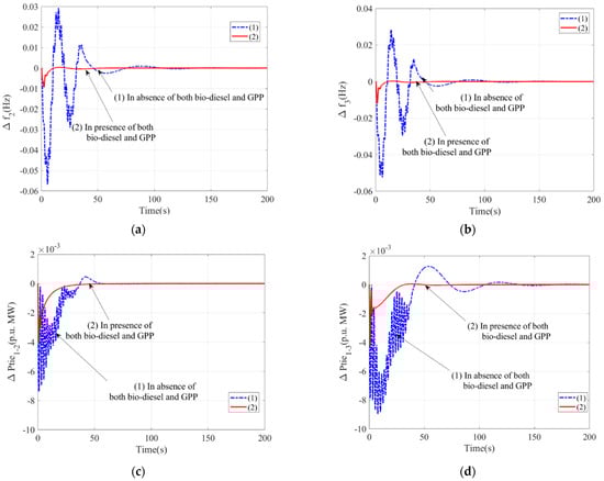 - In Figure 7, responses of the systems with and without biodiesel and GPPt are compared. The results in Figure 7 show the superiority of the system with biodiesel and GPP, concerning the diminished level of peak overshoot (Δf2 = 0 Hz, Δf3 = 0 Hz, ΔPtie1–2 = 0 p.u. MW, ΔPtie1–3 = 0 p.u. MW), extent of oscillations, peak undershoot (Δf2 = 0.009 Hz, Δf3 = 0.0012 Hz, ΔPtie1–2 = 0.0042 p.u. MW, ΔPtie1–3= 0.0041 p.u. MW), and settling time (Δf2 = 52.11 s, Δf3= 53.42 s, ΔPtie1–2 = 53.81 s, ΔPtie1–3 = 53.22 s).