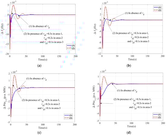 - In Figure 8, it is shown that the incorporation of time delay degrades the system. However, in order to make the system reflect real-world conditions, an association of time delay is needed; hence, the rest of the assessments were performed with time delay. With time delay, the level of peak overshoot (Δf1 = 0.0005 Hz, Δf2 = 0.00046 Hz, ΔPtie1–2 = 0.0018 p.u. MW, ΔPtie1–3 = 0.0011 p.u. MW), peak undershoot (Δf1 = 0.015 Hz, Δf2 = 0.011 Hz, ΔPtie1–2 = 0.0043 p.u. MW, ΔPtie1–3 = 0.0045 p.u. MW), and settling time (Δf1 = 68.11 s, Δf2 = 67.72, ΔPtie1–2 = 63.42 s, ΔPtie1–3 = 54.56 s) were much increased.