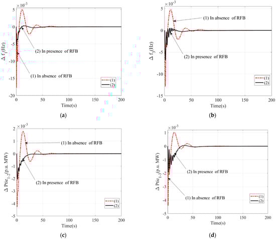 - In Figure 9, it is shown that the system with RFB with time delay has a great impact in terms of the diminished level of peak overshoot (Δf1 = 0.00001 Hz, Δf3 = 0.00001 Hz, ΔPtie1–2= 0 p.u. MW, ΔPtie1–3 = 0.000001 p.u. MW), extent of oscillations, peak undershoot overshoot (Δf1 = 0.0141 Hz, Δf3 = 0.0061 Hz, ΔPtie1–2= 0.0021 p.u. MW, ΔPtie1–3 = 0.0019 p.u. MW), and settling time overshoot (Δf1 = 50.11 s, Δf3 = 50.21 s, ΔPtie1–2= 49.81 s, ΔPtie1–2 = 51.42 s).