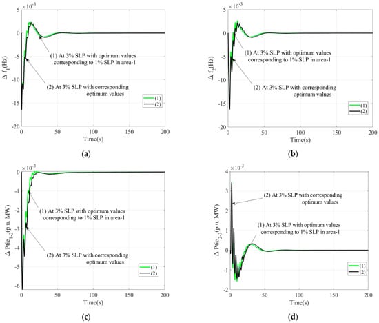 - In Figure 10, the sensitivity assessment shows that the controllers gains and parameters obtained at the nominal condition for 1% SLP is healthy enough. The values with 1% SLP provide similar responses to those obtained with optimized controller gains and parameters obtained at 3% SLP. Thus, the values should be altered.