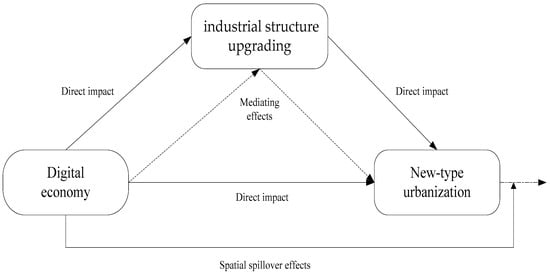 In the context of China’s urbanization transformation, the digital economy, as the new economic content of urbanization, is not only a new engine for urban function improvement, but also one of the important factors affecting the high-quality development of urban areas [27]. In fact, the development of the digital economy can not only directly affect the quality of urban development by virtue of its own characteristics and essence, but also indirectly promote high-quality urban development by promoting the industrial structure upgrading [28,29,30]. In addition, considering the “Metcalfe’s Law” and “Network Effect” of the Internet in the digital economy [31], there may be a spatial spillover effect on the quality of urban development. Therefore, this paper will mainly analyze the impact of the digital economy on the quality of new-type urbanization development from three aspects: direct effect, indirect effect, and spatial effect, and propose corresponding research hypotheses.