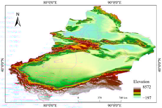 The Xinjiang Uygur Autonomous Region (hereinafter referred to as “Xinjiang”) is situated in Northwest China between 73°40′ E−96°23′ E and 34°25′ N−49°10′ N, with an area of 166 km2, being the largest provincial administrative region in China. Xinjiang borders eight countries, including Russia, with a total land border of over 5600 km. Xinjiang is characterized by an undulating terrain with the Altai Mountains, the Junggar Basin, the Tianshan Mountains, the Tarim Basin, and the Kunlun Mountains, as shown in Figure 1.