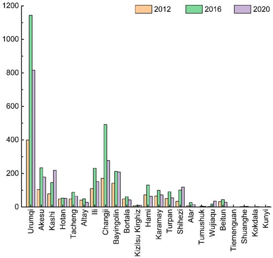 In terms of geographical distribution, the number of logistics enterprises should be evenly distributed in each city in space, but, in terms of supply and demand, logistics serves economic development, and the number of logistics enterprises in each city matches the economic and living needs. By comparing the number of POI of logistics enterprises in each city of Xinjiang in three time cross-sections, it can be observed that the spatial distribution of the logistics industry in Xinjiang has been unbalanced. The development momentum of logistics enterprises was largely concentrated in the provincial capital of Urumqi, Changji Hui Autonomous Prefecture, Bayingolin Mongol Autonomous Prefecture, Ili Kazakh Autonomous Prefecture, Akesu Prefecture, and Kashgar Prefecture. Kizilsu Kirghiz Autonomous Prefecture is an area with typical “low-lying land”. The increase in the number and size of local enterprises varied from place to place. From 2012 to 2020, Bayingolin Mongol Autonomous Prefecture, Kashgar Region, Shihezi City, Wujiaqu City, Shuanghe City, and Kokdala City maintained a positive development trend, while other prefectures and cities exhibited a decline after an increase.