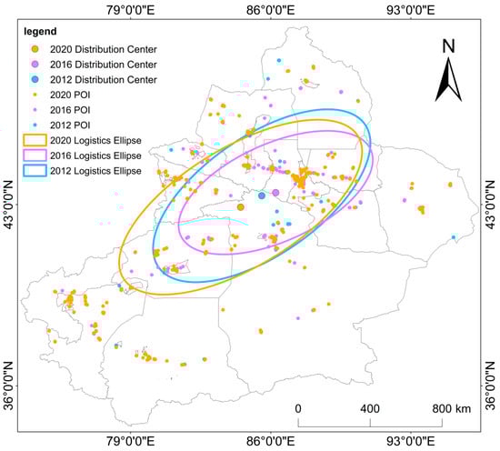 ArcGIS was used to analyze the standard deviation ellipses of logistics enterprises in Xinjiang in 2012, 2016, and 2020, as shown in Table 2 and Figure 3.