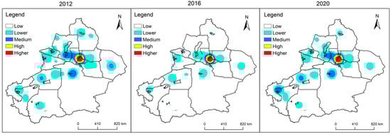An observation can be made from the nearest neighbor analysis of logistics enterprises that the actual nearest neighbor distance of logistics enterprises was smaller than the theoretical nearest neighbor distance from 2012 to 2020. At the three time nodes of 2012, 2016, and 2020, the average nearest neighbor indexes were 0.089, 0.076, and 0.096, respectively, which were all less than 1; and Z was also less than −2.58, indicating that the spatial distribution of logistics enterprises in Xinjiang was agglomerated—that is, there was agglomerated distribution. In 2012, the nearest neighbor index was 0.089, and the spatial distribution exhibited a trend of agglomeration. In 2016, the nearest neighbor index slightly declined to 0.076, and the spatial layout exhibited weak agglomeration. In 2020, the nearest neighbor index rebounded again to reach 0.096, exhibiting a trend of significant and consistently strong agglomeration. The agglomeration of logistics enterprises exhibited a significant U-shaped trend. The agglomeration of logistics enterprises was the highest in 2020, and the lowest in 2016.