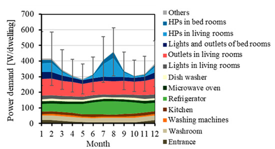 Figure 2 shows the seasonal variations in the average electricity demand per dwelling. The error bars indicate the standard deviation of the variations in total electricity demand among the dwellings. The electricity demand of the HPs for living rooms and other rooms is shown separately. Although the electricity demand for the outlets and lights was separately measured in living rooms, the total electricity demand for the outlets and lights was measured in other rooms (e.g., bedrooms). The electricity consumption of outlets in living rooms, refrigerators, and HPs in living rooms was high, accounting for 25.0%, 18.3%, and 9.5% of the total annual demand, respectively (Figure 2). The electricity consumption of HPs in bedrooms was considerably lower than that in living rooms. This can be attributed to the smaller floor area and shorter time of HP use for bedrooms than for living rooms. Considering time variations, as expected, HPs exhibited an evident seasonal trend with large winter and summer consumption. For example, the total electricity consumptions in August and February were approximately 1.6 and 1.4 times that in May, respectively. Although the values of summer were larger than those of winter, the heating degree days of the target year were larger than the cooling ones. This is caused by the combined usage of the gas floor heating system and HPs in the living rooms [4]. In addition to HPs, the electricity consumption by refrigerators shows a weak annual cycle, with summer consumption being 77% greater than in winter. The variations in total electricity consumption among households are large, with standard deviations ranging from 0.66 to 0.83 times the sample mean.