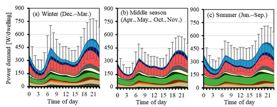 Figure 3 shows the daily variations in electricity consumption during winter (December–March), mid-season (April, May, October, and November), and summer (June–September). The total electricity demand was minimum at approximately 4:00 h, increased at 7:00 h, slightly decreased during the daytime (10:00–16:00 h), and reached its maximum at approximately 19:00 h during all three seasons. This diurnal variation is attributed to most of the items, except for refrigerators, such as lights, HPs, and dishwashers. Comparing the trends in HPs’ electricity between summer and winter, it is noted that the values in winter are larger at around 6:00–7:00 h in the morning when the outside temperatures are lower, resulting in sharper peak demand in total household summers. In contrast, summers show larger values than winters during the daytime when the cooling load is higher owing to solar radiation and high outdoor temperatures. The variation in total household electricity among households was the most significant in winter. This is partly because the dwellings had both gas-driven underfloor heating and electricity-driven HPs for heating living rooms, and there were differences in terms of which of the two heating systems was used more frequently in each dwelling.