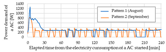 Figure 4 shows two examples of the observed time-series electricity demand patterns of HPs made by the same manufacturer with the same specifications installed in living rooms. Since the measurement dates of patterns 1 and 2 were August and September 2013, respectively, the HPs were supposed to be used for cooling. Both plots indicate that periods with no electricity consumption appeared intermittently. Furthermore, the timing and frequency of such intermittent zero-consumption periods differed between the two patterns. This regular intermittency was caused by the inverter control of the HPs and not by the occupants’ switching-on action. The difference between the plots can be attributed to the difference in the thermal load that the HPs have to tackle for establishing the set-point temperature in each room. This tendency suggests the diversity of the demand patterns of HPs.