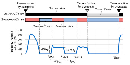 Figure 5 shows the definitions of the above variables, turn-on/off state, and power-on/off state. The turn-on/off state was changed at the time of the occupant’s action. Meanwhile, the power-on/off states were determined by the threshold of the HP electricity. The period of Δton,i corresponded to a power-on state where power is consumed at some level, and the period of Δtoff,i corresponded to the power-off state with approximately zero power consumption lower than the threshold.