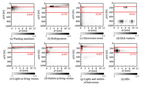 We calculated the variables determined in the previous section using the electricity consumption data of HPs and other major appliances. Figure 6 shows the joint probability (JP) distribution of ΔON and Δton of eight major appliances. Notably, (g) indicates the total electricity demand of outlets and lights in all bedrooms, and (h) includes all the HPs installed in both living rooms and bedrooms.