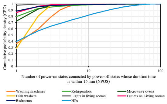 Figure 7 shows the cumulative probability density (CPD) of NPOS for the eight major appliances. The CPD reached 0.95 or higher at NPOS = 3 for all appliances except for HPs and washing machines. The CPD of washing machines also rapidly increased at NPOS = 3, and the difference from that of HPs became large, reaching approximately 0.98 at NPOS = 6. Conversely, the CPD of HPs was considerably lower than that of the others, reaching 0.95 at NPOS = 30 and 0.98 at NPOS = 50. This can be used to differentiate the turn-on/off of HPs from other appliances, in addition to the abovementioned features of ΔON and Δton.