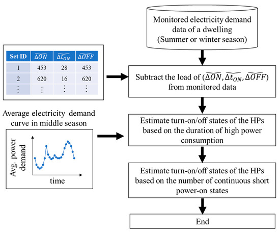 A flowchart of the pre-processing is shown in Figure 8. First, the average daily pattern of household electricity demand was calculated for the target dwelling based on the pre-acquired demand in the middle seasons with no HP use, which can be considered as the baseline demand. Subsequently, the household total power consumption patterns were characterised by a set of (Δ, Δ, Δ) associated with each sequential operation appliance. In addition, the set of (Δ, Δ, Δ) was examined to check whether the following three conditions were satisfied for all combinations of i and j.