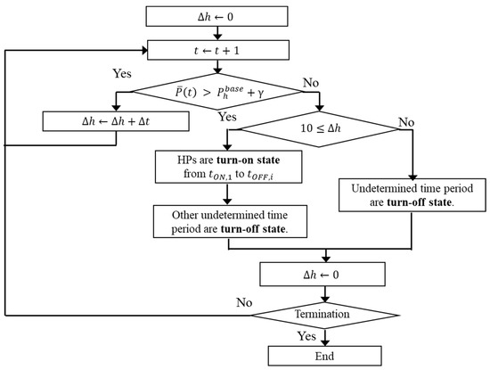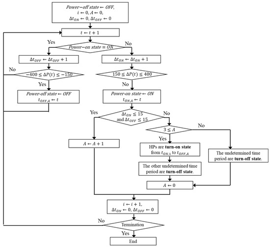 where indicates the set of time steps for the target demand data for estimating the turn-on/off state of the HPs, indicates the identification number of variables stored in a power-on state pattern table, and is the set of . When all conditions (11)–(13) were satisfied, the total power consumption P(t) was subtracted from for a period from t to based on the assumption that a sequential operation appliance operates within with an electricity consumption of .